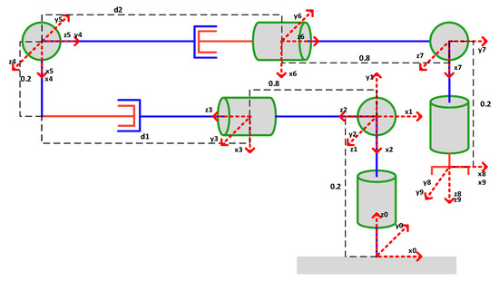 The kinematic model of the controllable telescopic space manipulator is shown in Figure 3, which is completed using the standard DH method [42] proposed by Denavit and Hartenberg. The coordinate system is attached to the base and the first joint. The coordinate systems are attached to the joint, and is attached to the tool.