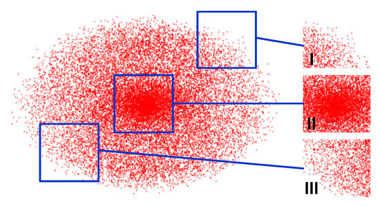 The workspace of a controllable telescopic space manipulator can be divided into two categories: reachable workspace and dexterous workspace. The reachable workspace refers to the set of all points that a manipulator can reach. The dexterous workspace refers to the set of all points with high manipulability. This paper uses the Monte Carlo method [44] to generate the reachable workspace of a controllable telescopic space manipulator, which faces issue with uneven information distribution and information loss. In order to visually distinguish the information distribution of the workspace, the workspace is projected onto the OXY plane and the workspace distribution shown in Figure 4 is obtained. As shown in Figure 4, regions I, II, and III represent different information distributions of the reachable workspace. Clearly, region I has denser information but regions II and III have more sparse information. This will affect the accurate description of the dexterous workspace.