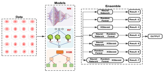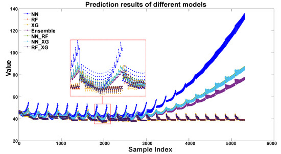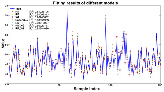 Secondly, the Random Forest (RF) model, Neural Network (NN) model, and XGBoost (XG) model are used as the base model to generate seven ensemble models through weighted combinations. The fitting results are shown in Figure 9, and it can be seen that the of different models mostly reach approximately 0.9, except for the Neural Network model. The best model is the combination of Random Forest and XGBoost.