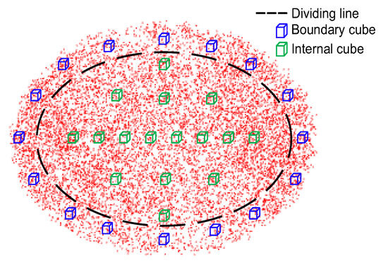 The data distribution is defined as boundary distribution and internal distribution, and they are separated with a dividing line, as shown in Figure 7. Then, sixteen blue and green small cubes are selected from boundary and internal areas, and the variance of point counts are computed by Equation (13) as the measure of data distribution quality.