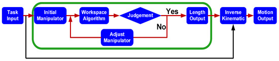 Step. 6. Take out any point from each small cubic element and record its corresponding joint angles as . Generate sets of new joints by Equation (12) and compute the corresponding points for by Equation (2). Finally, add the newly generated points into the original reachable workspace.