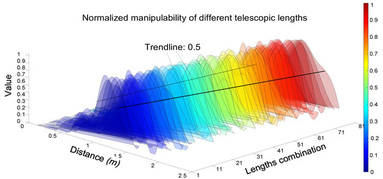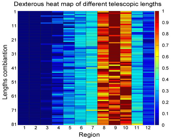 In order to provide a more intuitive comparison of the dexterous workspace distribution, the dexterous workspace under different telescopic lengths is divided into 12 regions, and the dexterous heat map is shown in Figure 15. It can be concluded that the dexterous regions of different telescopic lengths are all located in regions 8, 9, and 10 and it corresponds to 58% to 83% of the maximum reachable workspace. Additionally, the maximum manipulability is mostly located in region 9, providing a reference for adjusting the telescopic lengths.
