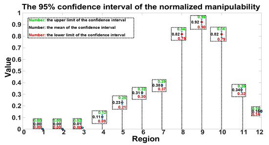 Next, this paper uses statistical methods to verify the reliability of the conclusion. The p-value computed by ANOVA [46] is much smaller than 0.05, indicating significant differences between the data and ruling out random errors, confirming statistical significance. The top three manipulability values under different telescopic lengths are computed, and the results show that they are all located in regions 8, 9, and 10. The 95% confidence interval of the manipulability is also computed for each region, as shown in Figure 16. The green, black, and red values represent the upper limit, mean, and lower limit of the confidence interval, respectively. The results indicate that the manipulability values in intervals 8, 9, and 10 are significantly higher than others, confirming the reliability of the conclusion.