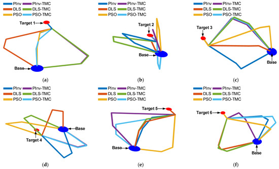 To verify the effectiveness of the TMC method, the PInv, DLS, and PSO algorithms are compared with and without the designed method. The specific steps are as follows: the above algorithms that applied TMC are defined as PInv-TMC, DLS-TMC, and PSO-TMC. All six algorithms are used to compute the inverse kinematics when the manipulator reaches different targets, as shown in Figure 17. The position of different targets is shown in Table 2, and target 1, target 3, target 5, and target 6 represent remote operation; others are nearby operation.