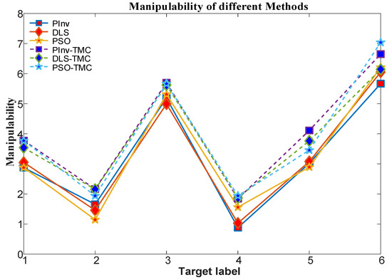 To verify the advantage of applying TMC to the manipulator’s motion dexterity, the manipulability is computed and the results are shown in Figure 18. The manipulability corresponding to each algorithm when it reaches different targets is shown in Table 3. It can be seen that the TMC method has higher manipulability when the manipulator reaches the target, which verifies that the TMC method follows the manipulability priority principle.