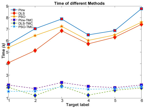 To verify the efficiency of applying TMC method to manipulator’s motion, the computational efficiency of each algorithm are analyzed and the results are shown in Figure 19. The time corresponding to each algorithm when it reaches different targets is shown in Table 4. It can be seen that the TMC method can reduce the computational time required for the manipulator to reach the target point. And the efficiency can be enhanced by 3.43, 3.53, and 3.64 times after applying the TMC method into PInv, DLS, and PSO algorithms.