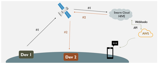 As illustrated in Figure 2, SWARM Device 1 (Dev 1) transmits a message containing specific information to a satellite (the maximum amount allowed is 192 bytes per one transfer [27]). The satellite, which is connected to the SWARM cloud platform known as HIVE, forwards the message to HIVE for storage. To efficiently monitor and receive notifications for incoming messages without the need to manually check HIVE repeatedly, we utilize the AWS platform. Specifically, we leverage AWS features such as APIs and Webhooks. We have implemented a Webhook-based system that periodically checks HIVE for new messages. When a message is detected, it is extracted and processed within the AWS environment. This method is discussed in detail in Section 3.