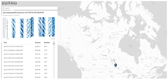 Winnipeg, Manitoba, Canada, low-orbit satellite connection [35]. The left table displays signal transfer quality, with color and elevation angle indicating connection strength, as well as if the satellite is in the area. The blue pin on the map marks the location of signal measurement at a specific time and day. Darker colors and higher angles represent better connectivity, though the transmission speed is slower compared with other locations.