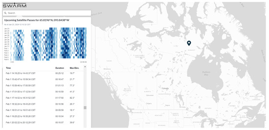 Nunavut, Canada, low-orbit satellite connection [35]. The left table shows the quality of signal transfer, with color and elevation angle reflecting connection strength, as well as if the satellite is in the area. The blue pin on the map indicates where the signal was measured at that particular time and day. This location provides improved connectivity compared with Winnipeg.