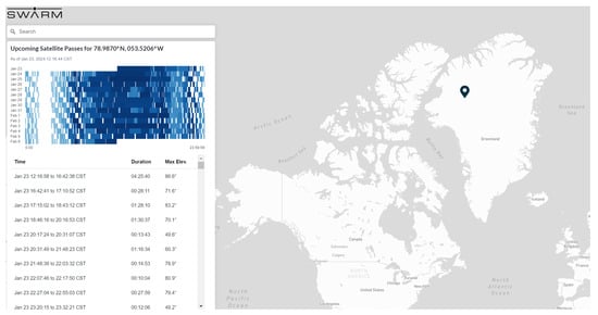 Greenland low-orbit satellite connection [35]. The left table illustrates signal transfer quality, with color and elevation angle indicating the strength of the connection. The pin on the map highlights the specific location of signal measurement for that time and day. Greenland shows the most favorable conditions for rapid message transmission with the highest connectivity.