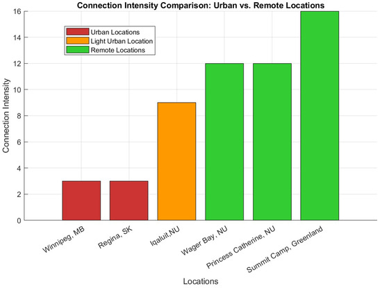 Based on Table 1 intensity factors, Figure 6 shows the chart of the approximate distribution of connectivity using those intensity factors. The chart provides a comparison of the intensities of the connection to SWARM satellites across various locations, with higher scores indicating better connectivity to SWARM’s satellite network. Urban locations, represented by dark red bars, show low connection intensities of 3, such as Winnipeg and Regina. Iqaluit, categorized as a light urban area (orange bar), has a moderate connection intensity of 9, indicating somewhat better connectivity compared with urban regions. In contrast, remote locations, indicated by green bars, have higher connection intensities ranging from 12 to 16, suggesting stronger satellite signals and more reliable connections to SWARM satellites. These remote locations, including Wager Bay, NU; Princess Catherine, NU; and Summit Camp, Greenland, have more robust satellite coverage, which is reflected in their higher scores. This chart helps establish that areas with less infrastructure or more isolated environments tend to benefit from stronger satellite connections, while urban areas with established networks show weaker connections.