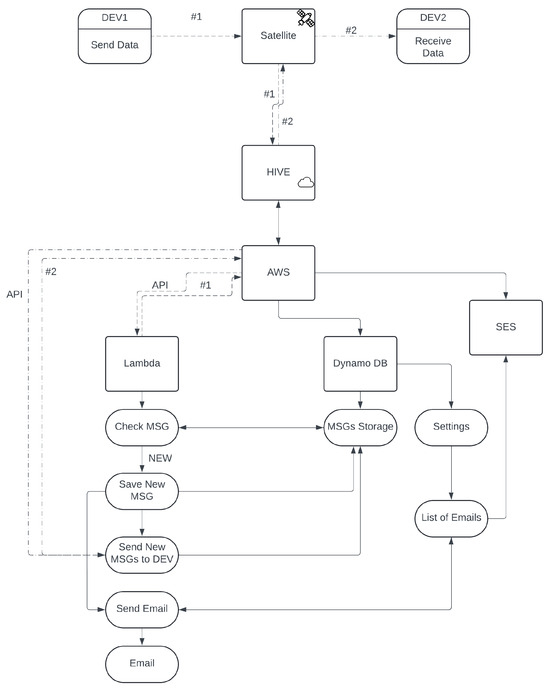 The flowchart shows the full process, including the AWS processes. Dashed arrows show the connection and data transfer between devices, satellites, and the HIVE cloud, which takes some time based on experiment values. The solid arrows indicate the process performed in the AWS cloud, which is an instant transfer and is outside the main transmission system (physical). The process starts at Dev 1, sending a message to the satellite. Then, following number #1, the API is used to receive a message and then processed at the AWS cloud, where response message #2 can then be followed back up to Dev 2.