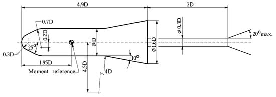 The Hypervelocity Ballistic (HB) standard model is an axisymmetric cone-cylinder body with a blunted conical nose having a 25° half-angle. It was proposed [] in 1960 by the Von Karman Gas Dynamics Facility in AEDC, US, in two configurations, designated HB-1 and HB-2. The most-used HB-2 configuration has a 10° tail flare (Figure 2), in order to reduce the model’s sensitivity to viscous effects []. Unit length for the definition of model shape is the diameter (D) of the cylindrical forebody. The length of the model is 4.9 D. The reference point for moments is at 1.95 D from the nose tip.