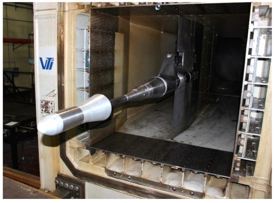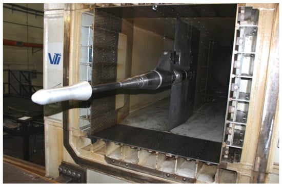 The T-38 wind tunnel (Figure 5) is the most used and the most capable aerodynamic test facility in VTI []. It is a 1.5 m × 1.5 m, pressurized, blowdown-type wind tunnel, operating in the subsonic, transonic and supersonic speed ranges. For subsonic and supersonic tests a solid-wall test section is used. A test section with perforated porous walls is added to the wind tunnel configuration for transonic tests. Depending on Mach number, the porosity of ventilated walls of the transonic test section is varied between 1.5% and 4%. Optimum porosity settings for each Mach number were determined during the calibration of the wind tunnel [], so as to minimize the wall interference effects and wave reflections from the walls.