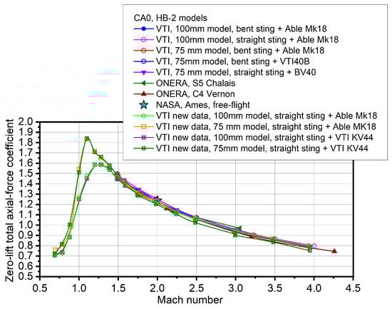 Zero-lift total axial-force coefficient of the HB-2 models vs. Mach number from different experimental sources. The VTI test envelope has been extended to transonic speed range.