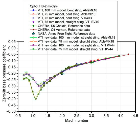 The base pressure coefficient Cpb = (Pb − Pst)/q, where Pst is the free-stream static pressure, was computed by assuming a constant base pressure Pb over the entire base of the model(s). Base pressure was measured at one point only, in the model cavity accessed by the annular opening on the base of the model around the support sting. The measured pressure was assumed to be close to average base pressure in the presence of a sting (correct integration of an average base pressure on a model with a large base, as on the HB-2 configuration, can be a matter of debate).