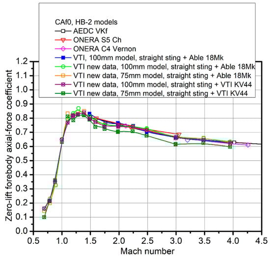 Zero-lift forebody axial-force coefficient of the HB-2 model vs. Mach number from different experimental sources. The VTI test envelope has been extended to transonic speed range.