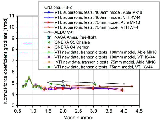 Gradient of the normal-force coefficient of the HB-2 models vs. Mach number from different experimental sources. The VTI test envelope has been extended to transonic speed range; VTI supersonic test data have been updated.