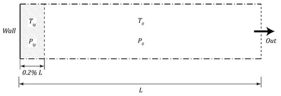 The problem under consideration was 1D. The results obtained, valid for a 1 m2 cross-section, were scaled to the actual cylindrical cross-section area of the PDE. The working fluids were  and air. The phases simulated using CFD were: (a) ignition (detonation wave propagation inside the tube) and (b) exhaust (blowdown of burned gases to the ambient environment). Figure 2 shows a sketch of the computational domain. A closed end is present at , and an open end is present at . The shaded area of length  represents the initial ignition region.