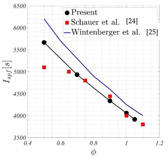 Black dots: present results. Red squares: Schauer et al. [], experimental. Blue line: Wintenberger et al. [], analytical.  is the fuel-based specific impulse.
