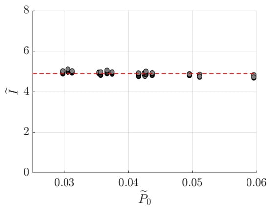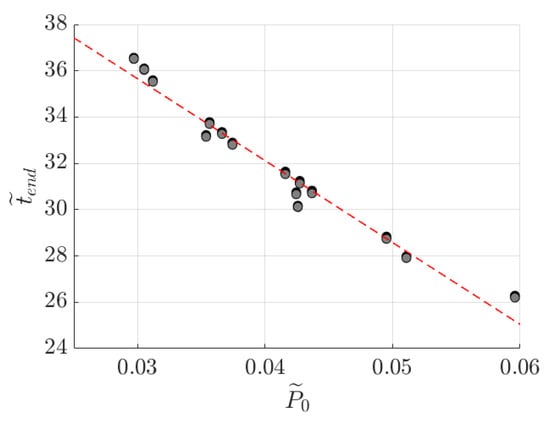 Figure 4, Figure 5 and Figure 6 show  versus ,  versus  (non-dimensional initial pressure in the cylinder), and  versus , respectively. The actual plots of the 480 results (solid dots) suggest that simple analytical relations (dashed black lines) could be fitted to them. In particular,  and  happen to be constant, while  correlates linearly with . The analytical expressions for the fitting curves are: