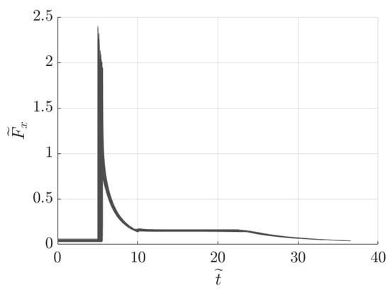 The evolution of the dimensionless thrust, , versus the dimensionless time, , is shown in Figure 7. It could be observed that the 480 numerical profiles collapse into a single curve.