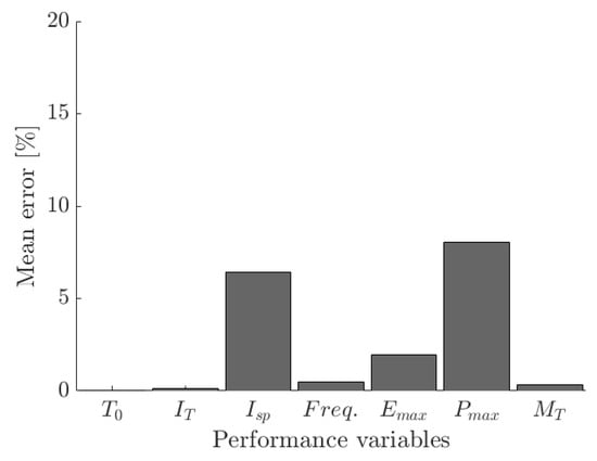 An error vector of seven components was obtained for each test case, corresponding to the seven output parameters. The mean error per variable is shown in Figure 8. For all performance parameters, the mean error was less than 10%. The maximum mean errors (between 5% and 10%) occurred for the specific impulse and peak cycle pressure. The mean errors for the other parameters were less than 2%. In current industrial practice, these errors are acceptable for performance studies in conceptual design phases.