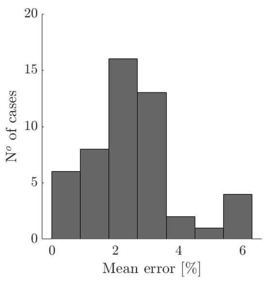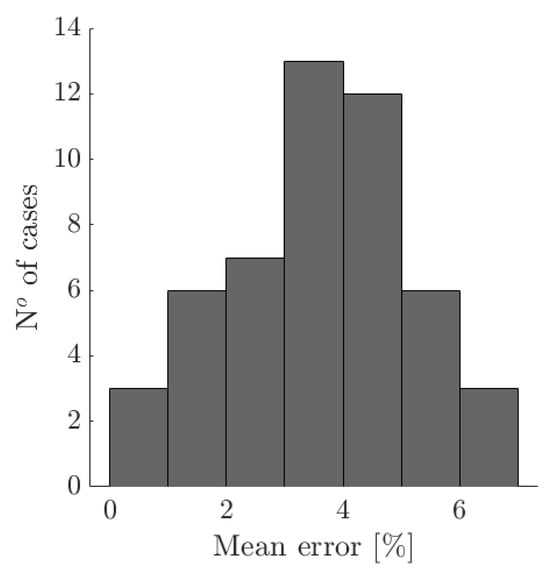 The distribution of the mean error per test case was computed and the results are represented as a histogram in Figure 9. The distribution is centered on an error of 2.5% and the maximum mean error was 6.2%, which, again, is acceptable for industrial applications.