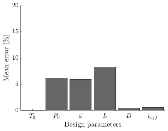 The counterpart of Figure 8, for the reverse problem, is represented in Figure 10. In this case, the parameters that presented the larger errors were the initial pressure, equivalence ratio, and PDE length. In any case, the errors were always smaller than 10%. The counterpart of Figure 9, for the incerse problem, is presented in Figure 11. In this case, the distribution is centered on an error of 3.6% and the maximum mean error was 6.6%. As in the case of the direct problem, these errors are acceptable in the context of pre-design conceptual studies.