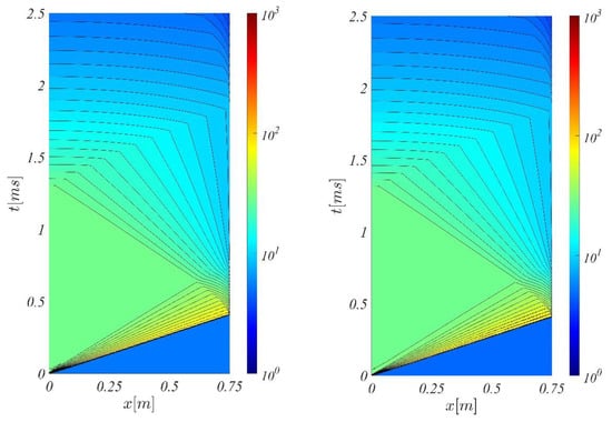 Spatial-temporal pressure field (logarithmic scale) evolution of test case . Comparison of results obtained via CFD (left) and data reduction relations (right).