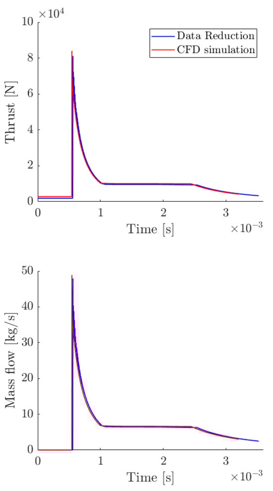 Comparison of time evolutions of thrust and mass flow. Blue line: data reduction. Red line: CFD.