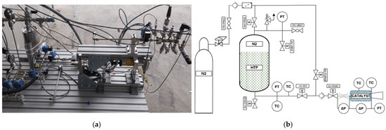 The test bench developed for the monopropellant thruster tests is shown in Figure 1a. The test bench was constructed from aluminum profiles, allowing easy reconfiguration and convenient attachment of instruments. The propellant tank, made of stainless steel, was pressurized using nitrogen gas. Pressurization and propellant feed to the thruster were controlled with solenoid valves, as shown in the P&ID diagram of the setup in Figure 1b. To ensure compatibility with high-concentration hydrogen peroxide, the propellant tank and piping underwent a passivation process. This process involved initial oxygen cleaning with distilled water in an ultrasonic bath, followed by immersion in a nitric acid bath and a 60% H2O2 solution.