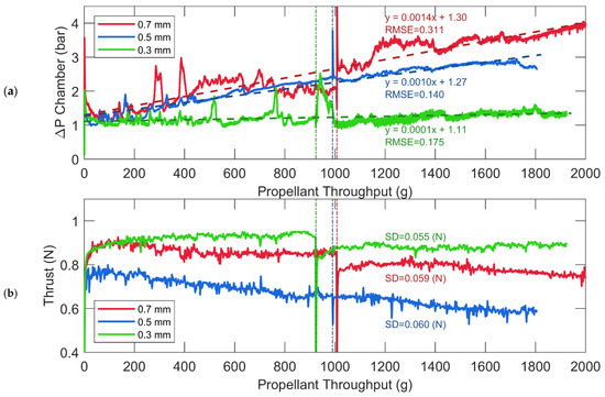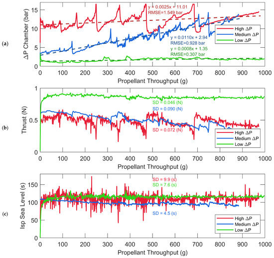 The first parameter characterized in the experiments was the packing of the catalyst pellets in the catalyst bed, which determines the initial pressure loss in the catalyst bed (). In the catalyst bed packing tests, three different initial pressure drop values were investigated. The test results are provided in Supplementary dataset. The trends versus propellant throughput are presented in Figure 3a. Higher pressure loss was achieved by compressing the catalyst bed to a greater extent, which also increased the mechanical damage to the catalyst pellets. The high degree of pellet damage led to greater amplitude fluctuations in , primarily due to channeling and sintering effects. The highest stability was observed in the low initial pressure loss test, where the pressure drop remained relatively steady, and the fluctuation amplitude was the lowest.