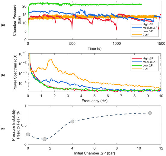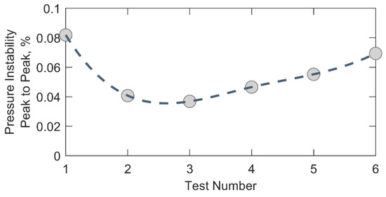 where peak to peak chamber pressure variation was defined as the difference between and , which are the maximum and minimum pressures recorded at the chamber exit, respectively. The experimental conditions for the initial experiments are summarized in Table 3.