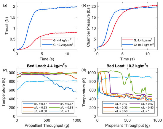 In bed load variation tests, two bed load values were evaluated by using injectors and nozzle throat diameters of varying sizes, as listed in Table 5. Temperature distribution within the chamber was monitored, allowing for an investigation into the decomposition rate at each corresponding bed load. This variation in bed load also affects the response characteristics of the thruster. To understand these effects, transient thrust and chamber pressure rise times were measured and analyzed. Each bed load test involved a total propellant throughput close to 1 kg.