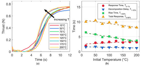 An important parameter that affects the delay characteristics and catalyst lifetime is the pre-heating temperature of the thruster. While higher pre-heating temperatures reduce thrust rise time and enhance response sensitivity, they also lead to increased heater power requirement and longer heating times. Additionally, cold starts cause catalyst deterioration. To investigate the impact of initial catalyst bed temperature on thrust rise time, a series of tests were conducted at eight different initial temperatures between 15 °C and 200 °C, as listed in Table 6. Before each test, the thruster’s heater was activated, and the catalyst bed was heated until a steady temperature was achieved throughout the entire catalyst.