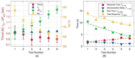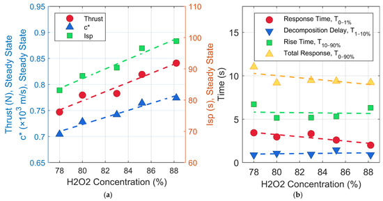 Due to the inherent instability of hydrogen peroxide, a low level of decomposition is expected over time, which results in a gradual decrease in the propellant’s concentration during a mission. To investigate the impact of the decreasing concentration on thruster performance, a series of tests were conducted with hydrogen peroxide concentrations ranging from 88.2% to 78%. The test parameters are presented in Table 7. Throughout these tests, thrust, specific impulse, and characteristic velocity were closely monitored to assess the performance variations. Since the concentration of the propellant directly affects the decomposition rate, it also influences the response characteristics of the thruster. Thrust rise times were measured to evaluate how decreasing propellant concentration impacts the thruster’s responsiveness during a mission.