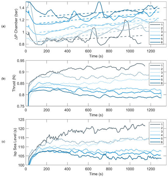 The lifetime tests involved six consecutive firing tests using the same catalyst bed, simulating the conditions of a space mission. Throughout these tests, thruster performance parameters such as , thrust, and specific impulse (Isp) were monitored. Furthermore, the variations in transient delays at each firing were investigated to evaluate how the aging of the catalyst bed affected the thruster’s response characteristics. Pressure instability was another focus of the study, providing insights into the stability and reliability of the thruster during its operation, particularly as the catalyst bed deteriorated.