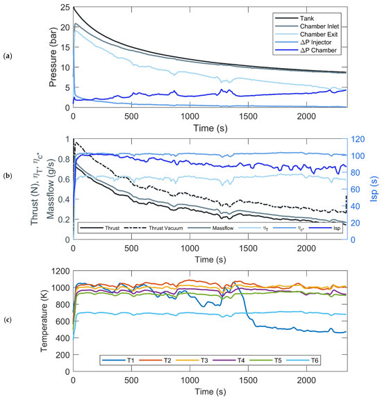 To investigate the blowdown characteristics of the thruster over the course of a mission, a test was conducted in which approximately 65% of the propellant tank was filled, resulting in a blowdown ratio of 2.9. The tank was then pressurized to 25 bar, after which the pressurization valves were closed. The thruster was operated until the propellant in the tank was exhausted. The HTP concentration was 87.5%. The catalyst bed was packed with 0.7 mm catalyst pellets, and the initial was set to approximately 1.5 bar. As the tank pressure dropped, key thruster parameters were monitored, including the variation in , mass flow rate, thrust, Isp, and temperature distribution within the catalyst bed.
