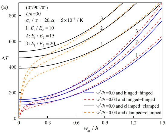 Figure 2 reflects the effects of the elastic modulus ratio and slenderness ratio on the critical buckling temperature of the bifurcation type for perfect FRC laminated beams with immovable clamped–clamped and hinged–hinged ends and different ply angles. From the above, it is found that for simply supported laminated beams, if the absolute values of the ply angles of the two symmetrical layers in geometry are different, there is no critical buckling value of the bifurcation type, so the buckling problem in this case is not considered. As can be seen from the figures, the critical buckling value generally increases first and then decreases with the increase in the elastic modulus ratio , and an increase in the slenderness ratio L/h will delay the decrease in critical buckling value with the increase in the elastic modulus ratio . For the given two boundary conditions, fixed support at both ends has higher buckling strength than simple support at both ends. One can also find that for a given number of common ply modes, when the ratio of elasticity modulus is small, [0°/45°/0°] beams have the best ability to resist instability; otherwise, [0°/90°/0°] beams are the best, while [45°/−45°/45°] and [45°/−45°] are the worst ply modes to resist buckling.