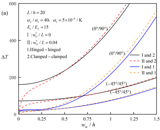 It is obvious that the post-buckling thermal load–deflection curve in this case is of the bifurcation type, and the post-buckling equilibrium path is stable. By letting , the critical buckling bifurcation points can be obtained