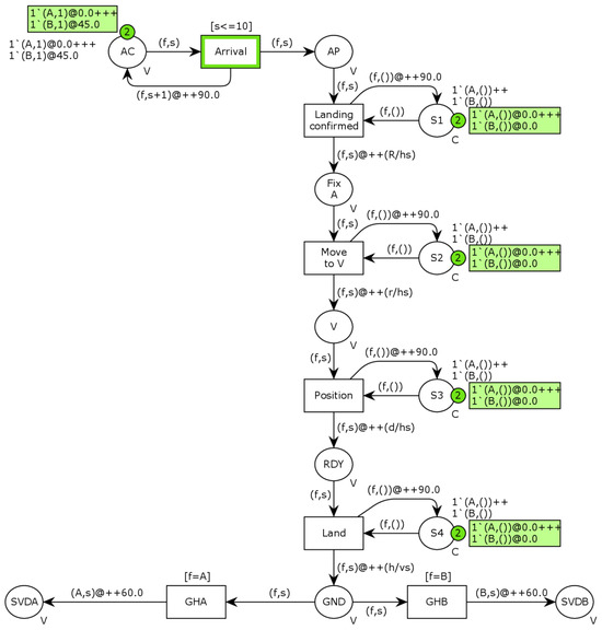 Colored timed Petri net model of a service line with two landing pads, showing different landing stages.