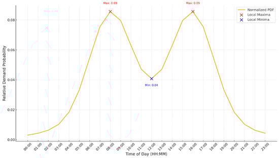An example of the input data used is shown in Figure 3. It is assumed that the traffic was not uniform but that there were two peaks—morning and afternoon. Figure 3 illustrates the relative demand probability of eVTOL arrivals across different hours of the day. Local maxima (red) indicate peak demand periods, while local minima (blue) highlight lower activity hours. The demand distribution follows a multi-peak pattern, reflecting typical urban transportation needs.