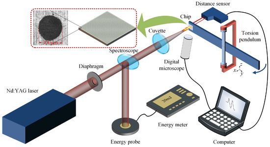It can be seen from the above relationship that the measurement of the impulse, I, is particularly important. Figure 1 is the schematic diagram of the impulse measurement system. The whole experiment was conducted in an atmospheric environment. The YAG pulse laser (Nimma-900, Beamtech optronics Co., Ltd., Beijing, China) provided the incident laser with a wavelength of 1064 nm, a pulse width of 6.5 ns, and a spot diameter of 6.5 mm. The incident laser was divided into two beams by the spectroscope after being shaped by the diaphragm. The splitting ratio was 60:40 (transmission:reflection). The reflected energy was received by the energy probe (J-50MB-YAG, Coherent, Saxonburg, PA, USA) and displayed by the energy meter (LabMax TOP, Coherent, Saxonburg, PA, USA) for real-time monitoring of the transmitted energy. The transmitted laser was focused by a convex lens (BK7, 75 mm, Daheng New Epoch Technology, Inc., Beijing, China) and used to ablate the chip placed on one side of the torsion pendulum. The spot diameter after focusing was about 300 μm. The schematic diagram of the chip is shown in the block diagram in Figure 1, and the enlarged image of one pit was obtained by scanning with the laser confocal microscope (OLS5000-SAF, OLMPUS, Center Valley, PA, USA). The ablation position was a cylindrical pit filled with the propellant. In order to avoid waste and degradation of the propulsion performance caused by splashing of the non-ablated part of the liquid, as well as to ensure full absorption of the laser energy, the diameter of the pit was 300 μm, which is consistent with the light spot, and the depth of the pit was 200 μm, which is consistent with the absorption depth of the propellant. The laser spot size was fixed by the optical configuration, and the energy adjustments primarily modulated fluence rather than beam geometry. The pits are evenly distributed on the chip, arranged in a 34 × 34 pattern. The edge length of the chip is 25 mm, and the thickness is 1.5 mm. The chip made of aluminum was processed by Kunshan Chuangqiu Precision Technology Co., Ltd. (Suzhou, China). The propellant was injected into the pit by the customized sample addition system, and the number of drops added was recorded. The mass of the propellant for a sufficient number of drops was weighed using an electronic balance to calculate the mass of the added propellant. The masses of the four used propellant samples (H2O, 20 wt.% ADN, 40 wt.% ADN, and 70 wt.% ADN) were 5.8, 6.2, 6.5, and 6.8 μg, respectively. After the propellant was ablated by laser, the plasma jet was generated, which forced the torsion pendulum to rotate because of the reaction force. The linear displacement was measured using the laser distance sensor (PNBC001, Wenglor, Tettnang, Germany), and the ablation condition was observed using a digital microscope (AM7515, DinoLite, Taipei, China). The torsion pendulum was fixed on a translation stage (PT3/M-Z8, Thorlabs, Newton, NJ, USA) and could be moved in the vertical plane to change the position of each ablation.