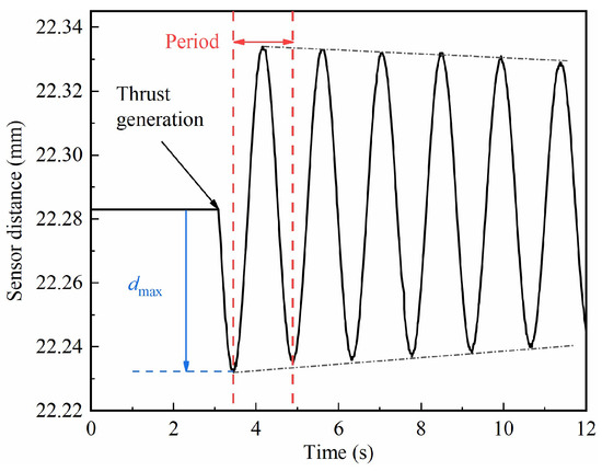 A typical measurement curve of a single-pulse impulse of ADN-based liquid propellant is shown in Figure 2. Before the propellant was ablated by the laser, the torsion pendulum was basically kept in an equilibrium position, and the value measured using the distance sensor was approximately constant. After the propellant was ablated by the laser, thrust was generated, and the torsion pendulum started to rotate, reaching the maximum displacement, dmax. Subsequently, the amplitude gradually decreased under the joint action of system damping and air damping. The impulse, I, can be obtained from the relationship between I and dmax, as established in Equation (4). It should be noted that, unlike the general thrust measurement curve [39,42], the distance sensor was on the same side of the torsion pendulum as the ablation position and opposite to the plume injection, so the measurement distance decreased first.