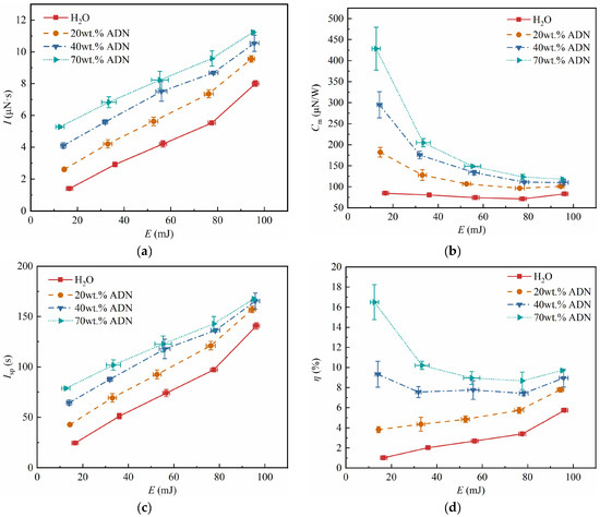 The thrust performance measurement results for the different propellants (H2O, 20 wt.% ADN, 40 wt.% ADN, and 70 wt.% ADN) under varying laser energies are shown in Figure 3. Figure 3a displays the impulse curves of the above four propellants at different laser incident energy. With the increase in laser incident energy, the impulse increased approximately linearly. The impulse of H2O increased from 1.40 μN·s at a laser energy of 16.62 mJ to 8.00 μN·s at a laser energy of 96.22 mJ. The impulse of 70 wt.% ADN increased from 5.27 μN·s at a laser energy of 12.52 mJ to 11.23 μN·s at a laser energy of 95.10 mJ. This is because the higher the laser energy, the more energy is absorbed by the liquid propellant, and the stronger the ablation jet generated, the greater the impulse brought by the reaction force. For a specific propellant, the total chemical energy is constant. On the premise that the released chemical energy remains basically unchanged, the increment in the impulse was all due to the increase in the laser energy, so the impulse basically changed linearly with the laser energy. Figure 3a also shows that the higher the mass fraction of ADN in the propellant, the greater the impulse, which is because under the same laser energy conditions, a higher mass fraction of ADN means more chemical energy, resulting in a stronger ablation jet. So, the impulse increases with the increase in the ADN mass fraction.