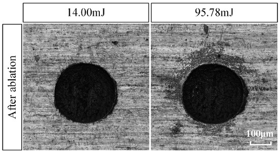 All working conditions mentioned in this paper meet the breakdown condition of the Phipps model. Observing Figure 3a, it is not difficult to find that when the laser energy was less than 80 mJ, the impulse growth rate underwent no significant change, but when the laser energy was higher (near 100 mJ), the impulse of all propellants had an inexplicable “uptick”. By viewing the pit ablation at this energy (Figure 4), there were obvious ablation marks at the pit edge compared with the ablation pit at a lower energy. This indicates that when the laser energy was too high, the edge energy of the spot exceeded the chip breakdown threshold, causing some aluminum to be ablated, resulting in additional impulses, which led to the sudden increase in the impulse curve at a large energy. Therefore, only the first four data points are fitted according to Equation (6). Considering the intervention of chemical energy, H2O itself does not contain it, but the H2O had a large endothermic peak, so it would cause partial losses of the laser energy. When the laser energy is less than a certain threshold, no impulse will be generated. For ADN-based propellants of varying proportions, the addition of chemical energy could lead to an elevation in the impulse curve compared to H2O. Because the total chemical energy was constant and the laser energy used in the experiment reached a relatively high level, the release of chemical energy could be maximized theoretically. If the chemical energy release changed significantly with laser energy within the data range shown in Figure 3a, then for a certain energetic propellant, the impulse curve would have an inflection point. After the inflection point, the increase in the impulse would only be related to the incident laser energy, and the growth rate would slow down. In addition, the impulse of the propellant with a higher ADN mass fraction should exhibit a faster growth rate. However, these phenomena were not observed in this image. Therefore, it is reasonable to assume that the maximum release of chemical energy was achieved in the illustrated energy range. Therefore, the difference in the chemical energies of the different propellants can be reflected by the intercept of the fitting curve, from which the fitting relationship can be determined as follows: