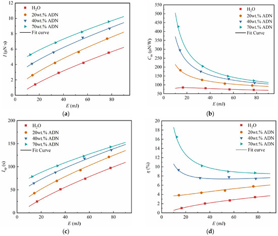 where a and b are undetermined coefficients related to the propellant, and E0 is the minimum energy of the impulse generated by the laser breakdown of the propellant. The fitting results and fitting curves are shown in Table 2 and Figure 5a. The fitting results are good, and the R2 values are all greater than 0.998, verifying the previous idea. Meanwhile, the higher the ADN mass fraction of the propellant, the larger the value of intercept a, further demonstrating the necessity of the introduction of the intercept in explaining the influence of the chemical energy on the impulse. Coefficient b exhibited little difference, indicating that the release of chemical energy by the propellants with varying ADN contents did not change with a laser incident energy within the range of the fitting data, which reflects that the chemical energy’s release had reached the maximum. It should be noted that although the difference in b was not significant, it causes the rule that the higher the ADN mass fraction, the greater the propellant impulse to no longer hold at high energy. It can be seen from Table 2 that the 20 wt.% ADN corresponds to the largest b, so its impulse will exceed that of the other propellants at high energy, which partly indicates the limitations of Equation (7). There are other factors that affect the impulse, and further research is needed. In addition, Equation (7) is not applicable when the laser energy is too small, because plasma cannot be generated at this time. In fact, when the incident laser energy is 0, the impulse must be 0, which cannot be explained by Equation (7), so this equation is only applicable within a certain energy range. Figure 5b–d show the impulse coupling coefficient, specific impulse, and ablation efficiency results calculated according to Equations (1)–(3), respectively. They are in good agreement with the experimental data and can be used to analyze and predict the relevant propulsion parameters within a certain range.