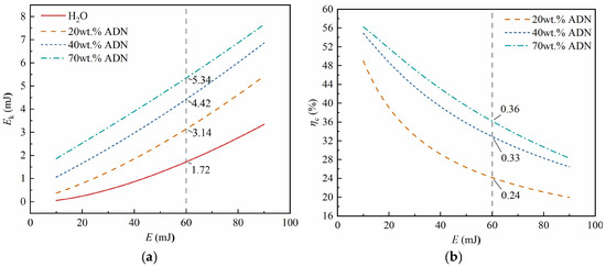 Figure 6a shows the Ek of the H2O, 20 wt.% ADN, 40 wt.% ADN, and 70 wt.% ADN at various laser energies. Within the energy range shown, the kinetic energy of the four propellants increased with the increase in the laser energy, and the higher the mass fraction of ADN, the greater the kinetic energy at the same energy. When the incident laser energy is 60 mJ, the Ek corresponding to the four propellants were 1.72 mJ, 3.14 mJ, 4.42 mJ, and 5.34 mJ. In addition, the greater the laser energy, the more obvious the difference in the kinetic energy between the H2O and other propellants.