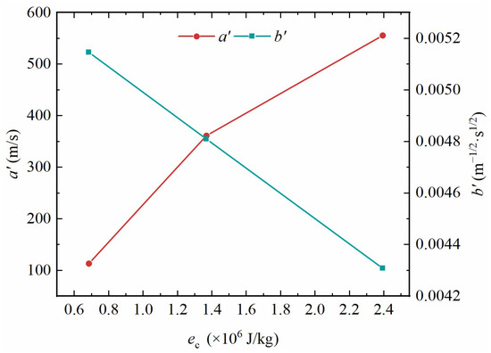 where the units for e and i are J/kg and m/s, respectively. It can be seen from Section 3.2 that a′ and b′ are coefficients related to the propellant, so we try to establish the relationship between a′, b′, and the chemical specific energy ec (unit: J/kg). The variations in a′ and b′ with respect to ec are shown in Figure 7. To facilitate the derivation of the formula while reducing the error, a linear relationship is used to approximate the data. The numerical result is as follows: